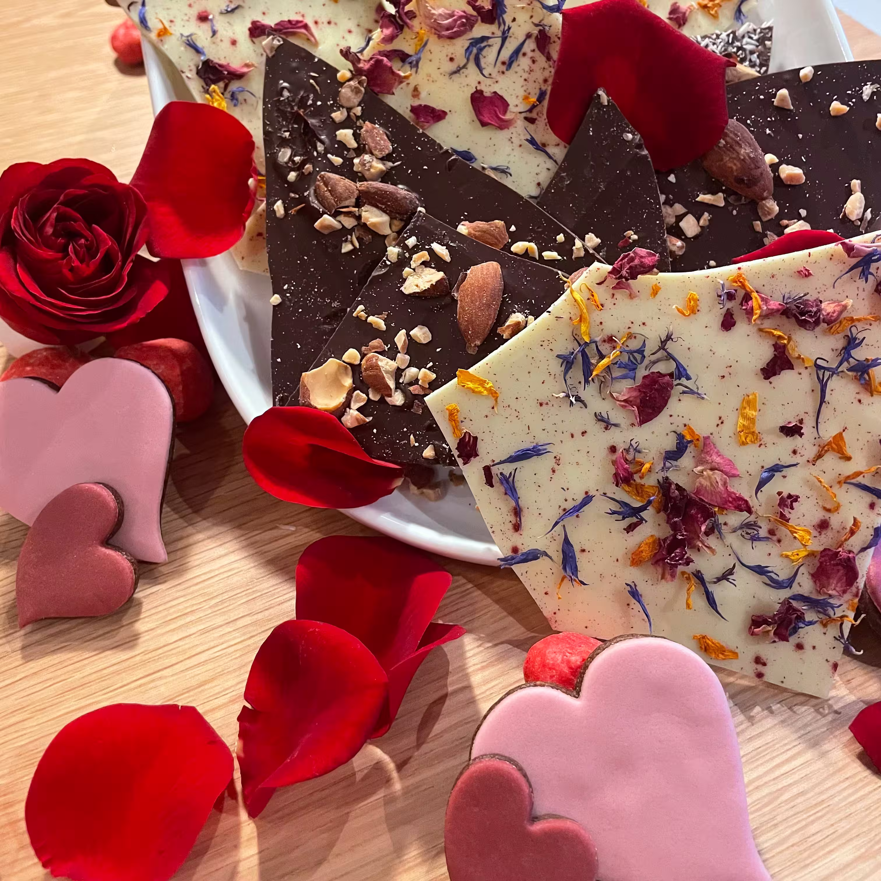 Notre bouquet garni de chocolat est une création aussi élégante que gourmande, pensée spécialement pour la Saint-Valentin. Il réunit 250 g de chocolats fins — noir intense, lait fondant et blanc délicat — sublimés par des fruits secs croquants et de fleurs séchées comestibles pour une expérience aussi belle que savoureuse.