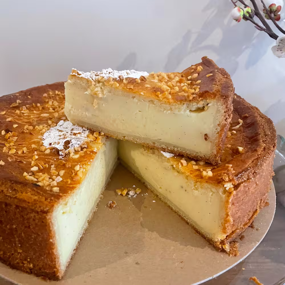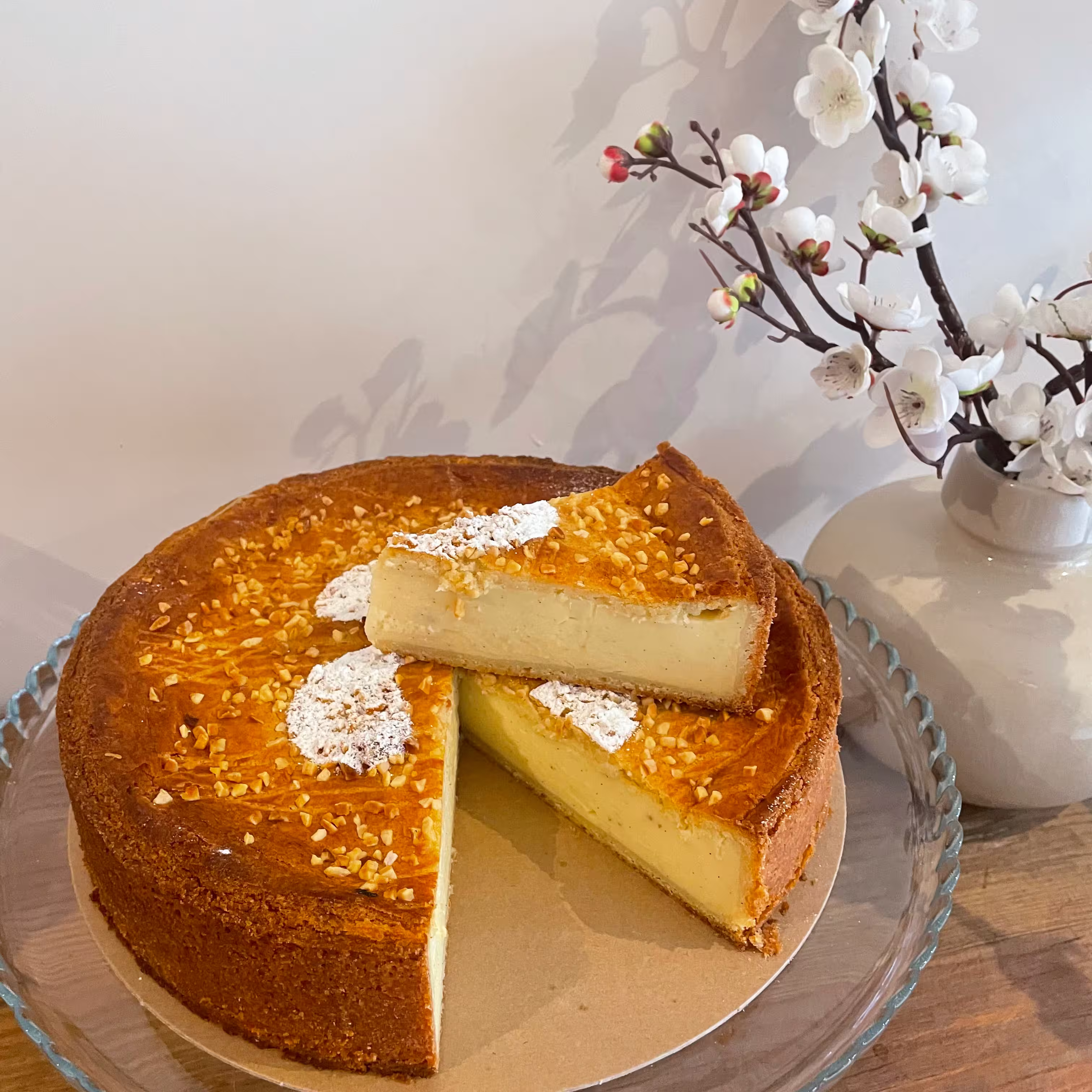 Découvrez notre incontournable gâteau basque, élaboré à partir d’une pâte à tarte spéciale délicatement dorée. Son coeur généreux de crème pâtissière onctueuse, subtilement parfumée au rhum, offre un équilibre parfait entre douceur et caractère !